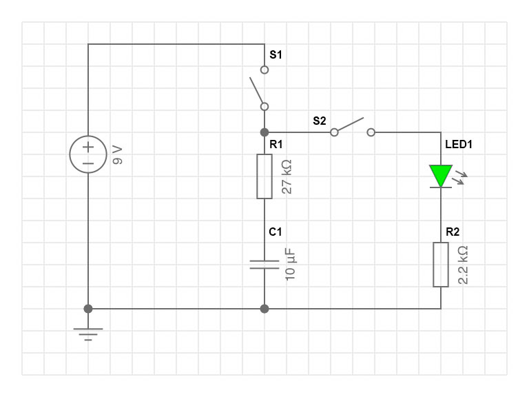 Reihenschaltung aus LED und 2,2-Kiloohm-Widerstand. Über Schalter S1 wird der Kondensator