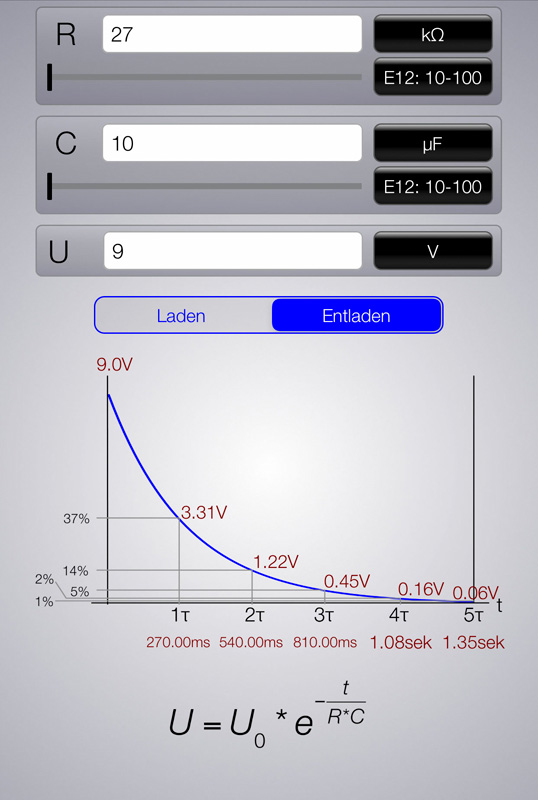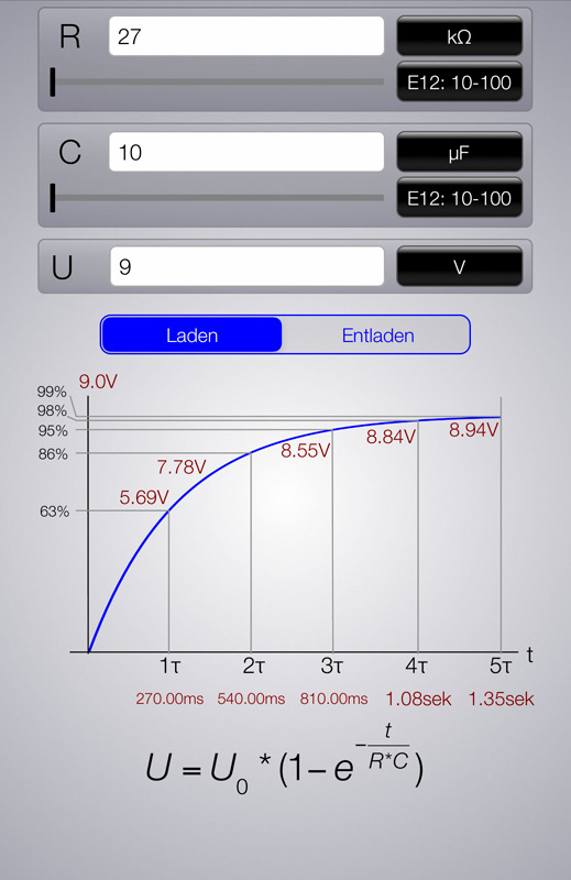 Eingegeben werden die Werte für Vorwiderstand (Volt), Kapazität (Farad) und Ladespannung (Volt). Daraus errechnet die App fünf Wertepaare Kondensatorspannung in Volt/Tau in Sekunden und zeigt damit an, nach welchem Zeitintervall welche Aufladung erreicht ist. Unter dem Diagramm wird die für die Berechnung zugrundeliegende Formel für die Ladung eines Kondensators angezeigt: