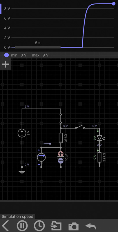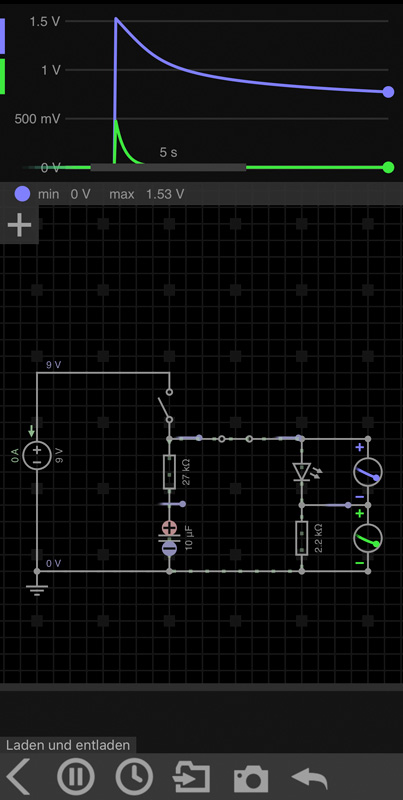 Nun wird S1 geöffnet und S2 geschlossen. Der Kondensator entlädt über die LED und den Vorwiderstand, wobei die Spannung – und damit der Strom – zu Beginn rasch kleiner wird. Die violette Kurve zeigt den Verlauf des Spannungsabfalls an der LED, die grüne Kurve den Verlauf am Vorwiderstand. Die LED leuchtet in der Simulation schwach auf. Hier wird deutlich, dass die Kennlinie einer LED ebenfalls exponentiell verläuft. Der Verlauf des Spannungsabfalls nach Absinken unter den Schwellspannungs-Punkt erfolgt zunehmend flacher, da sich der Diodenwiderstand erhöht. Ein immer kleinerer Strom fließt somit aus dem Kondensator durch die LED, deren Widerstand zunehmend größer wird, beide Phänomene „halten die Kurve flach“. Der Spannungsabfall am Vorwiderstand entspricht hingegen der Entladekurve des Kondensators, die auch in der App (siehe Bild oben) zu sehen ist. Die Spannung fällt exponentiell - und schneller als an der LED - auf 0 Volt.