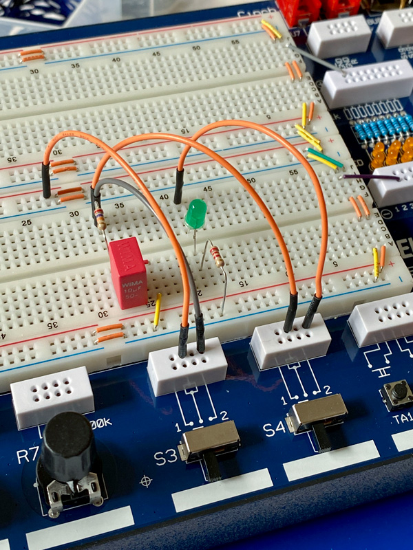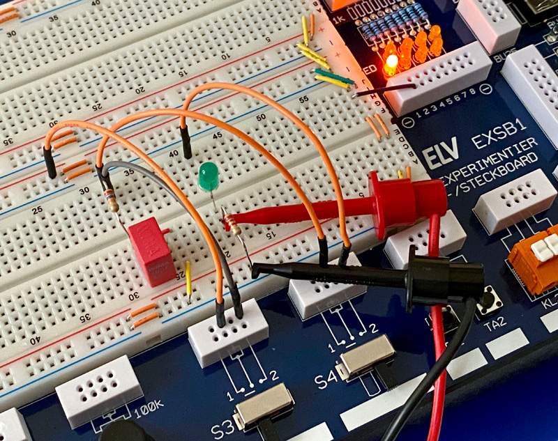 und Anschlüsse außerhalb des Steckbretts bereithält und damit Platz spart. S1 und S2 werden über die Schalter S3 und S4 unterhalb des Steckbretts realisiert. Nach Aufladen des Kondensators über S1 und