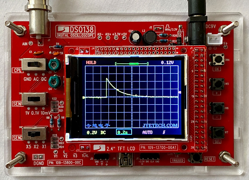 Entladung, die LED blitzt auf. Das kleine Digital-Oszilloskop