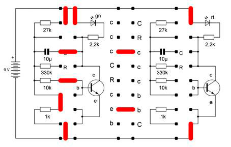 Start mit der oberen Steckbrücke leuchten beide LEDs mit voller Helligkeit.