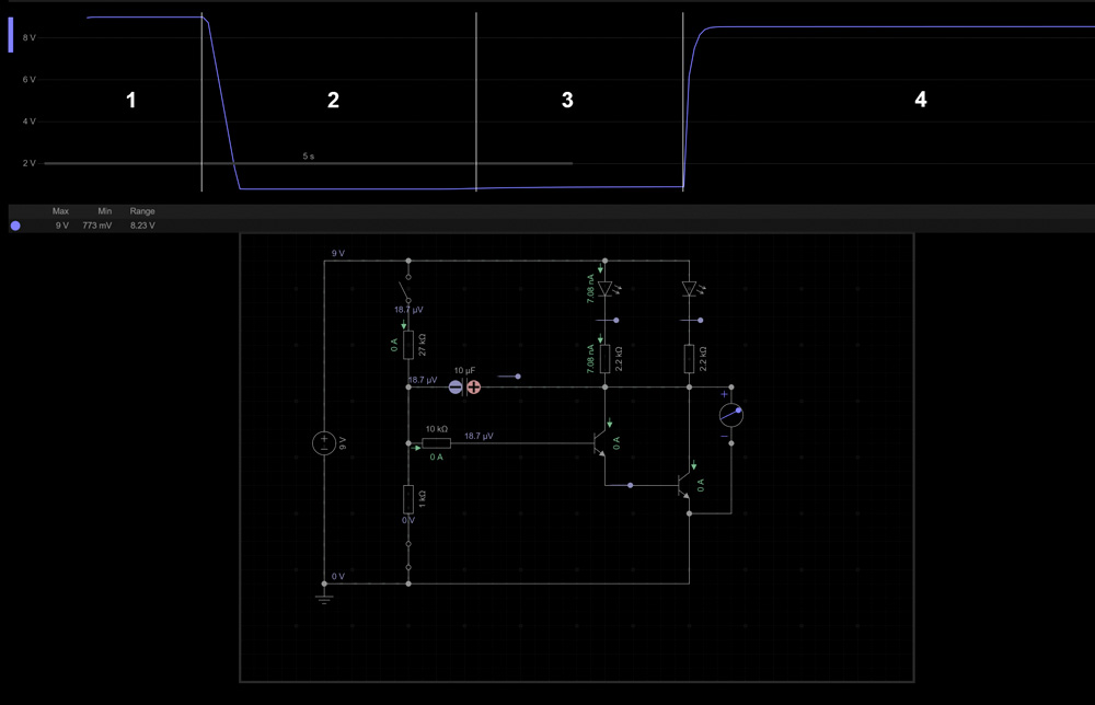 C1 werden von der Betriebsspannung abgekoppelt. C1 entlädt nun über R3 und T1.