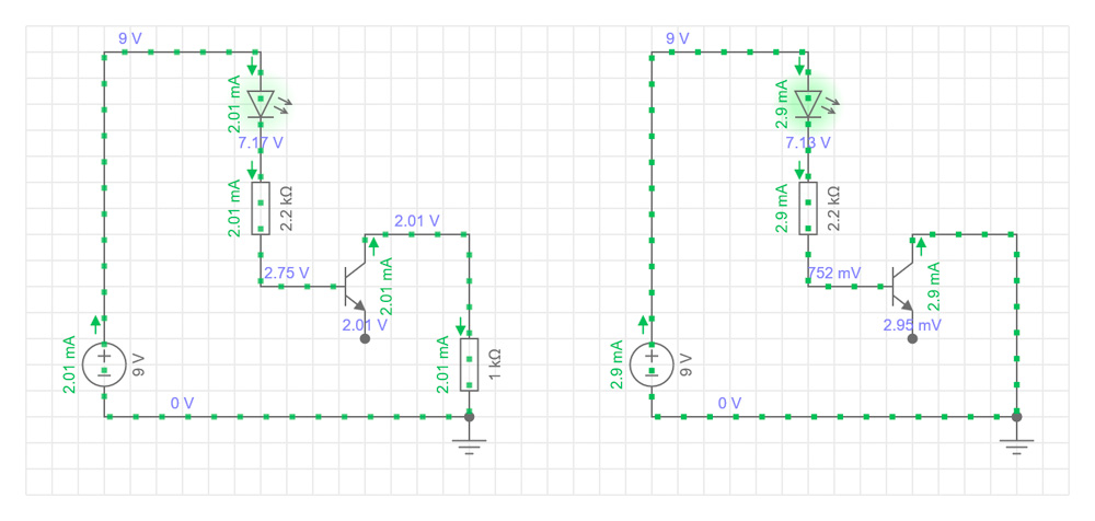 eine Stromreduzierung auf der Basis-Kollektor-Strecke (von 2,9 mA auf 2,01 mA),