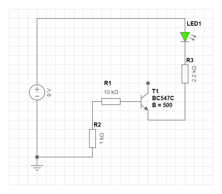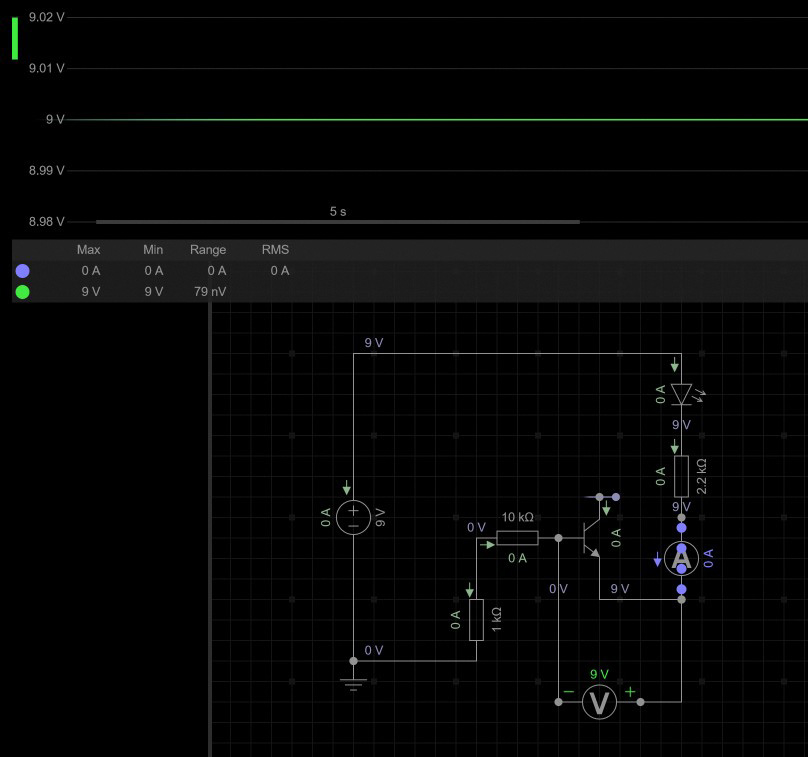 Die Schaltungssimulation zeigt, dass – nahezu – die gesamte Betriebsspannung in der Höhe von 9 Volt an der Basis-Emitter-Diode in Sperrrichtung abfällt. Dh die Strecke ist annähernd hochohmig und sperrt, es fließt so gut wie kein Strom in der Reihenschaltung, folgerichtig zeigt auch das Amperemeter 0 Ampere.