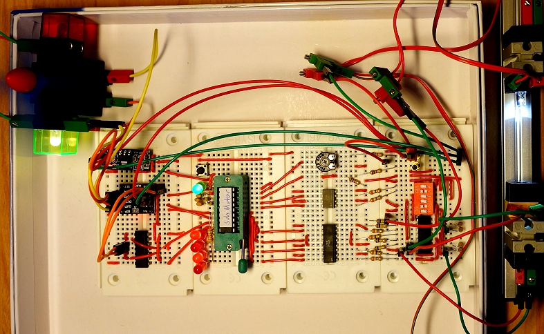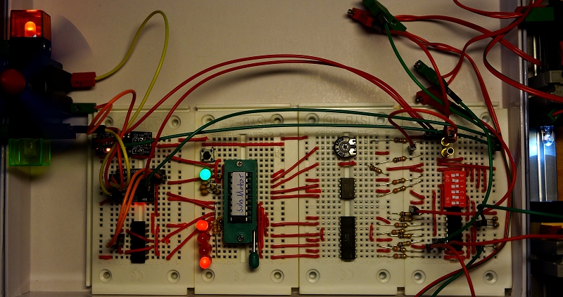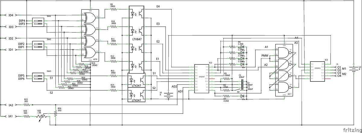 Die TPS-Grundschaltung wird wie in der Anleitung zum Lernpaket beschrieben aufgebaut, jedoch werden die beiden Schalter S1 und S2 nicht eingebaut. Stattdessen werden ihre Eingänge direkt mit den Kollektor-Ausgängen des Optokoppler LVT427 verbunden. Die anderen Eingänge E1-E4 werden an die Kollektor-Ausgänge des Optokopplers LVT827 angeschlossen. Alle Emitter-Ausgänge werden auf GND gelegt. Der PMW-Ausgang wird jeweils mit den Ausgängen A1 und A2 UND-verknüpft (2xNAND in Serie) und an die Eingänge IN1/IN2 des Motortreibers DRV8833 (2-Kanal-DC-Motortreibermodul, H-Brücke, 1,5A pro Kanal, 3-10V, z.B. bei roboter-bausatz.de für wenige € erhältlich) angeschlossen. Die Ausgänge A1/A2 funktionieren als Enable für die Weiterleitung des PMW-Signals an die Eingänge IN1/IN2 des Mototreibers und bestimmen die Drehrichtung des Motors. Die Ausgänge A3 und A4 werden direkt mit den Eingängen IN3/IN4 des Motortreibers verbunden. Entgegen der Beschreibung des Händlers muss der Anschluss ULT, nicht EEP, des Motortreibers auf VCC gelegt werden, damit Signale an den Ausgängen Out1-Out4 ausgegeben werden. Der Anschluss EEP bleibt unbeschaltet. Das Treibermodul wird mit 9V Gleichspannung versorgt, die bei entsprechender Schaltung der Eingänge an den Ausgängen Out1-4 anliegt. Zur Versorgung der TPS/Mikrocontrollers werden die 9V auf 5V mit einem Mini Step Down-Modul AMS1117 6,5-12V auf 5V (z.B. roboter-bausatz.de, ca. 1 €) transformiert. Beiden Analogeingängen AD1 und AD2 ist jeweils ein Spannungsteiler aus jeweils zwei 1,0 kΩ-Widerständen (bei AD1 ist ein Widerstand durch ein 1,0 kΩ-Potentiometer ersetzt) vorgeschaltet, um die an den Eingängen IA1 und IA2 angeschlossenen (+)9V auf 4,5 V zu halbieren. Der Analogeingang AD1 ist mit dem Schleifer des Potentiometers verbunden, um eine variable Eingangsspannung von 0-4,5V anlegen zu können.