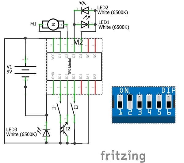 Der nachfolgende Schaltplan zeigt den Anschluss der Sensoren und Aktoren an das TPS-Modul sowie die Stellung der DIP-Schalter: