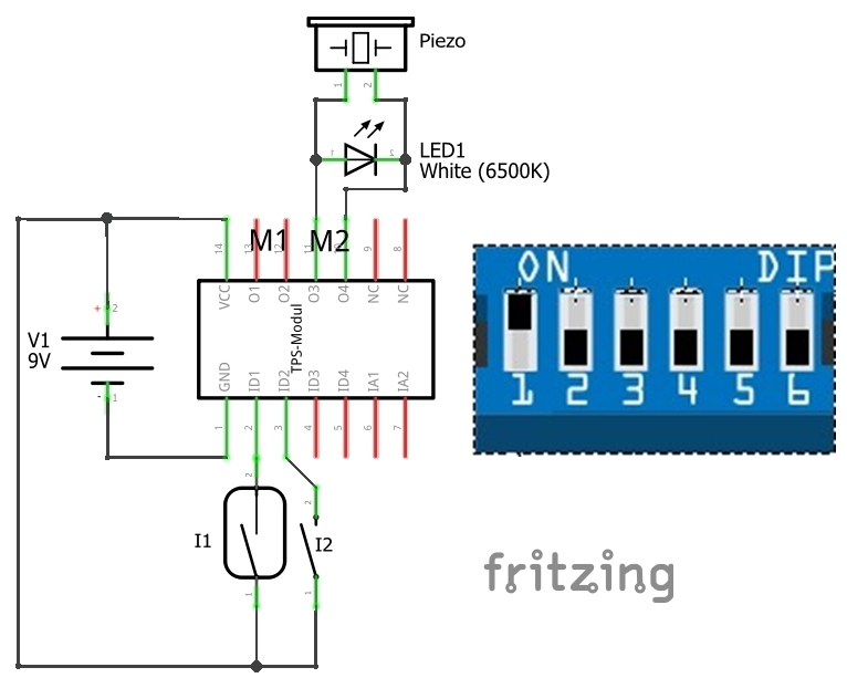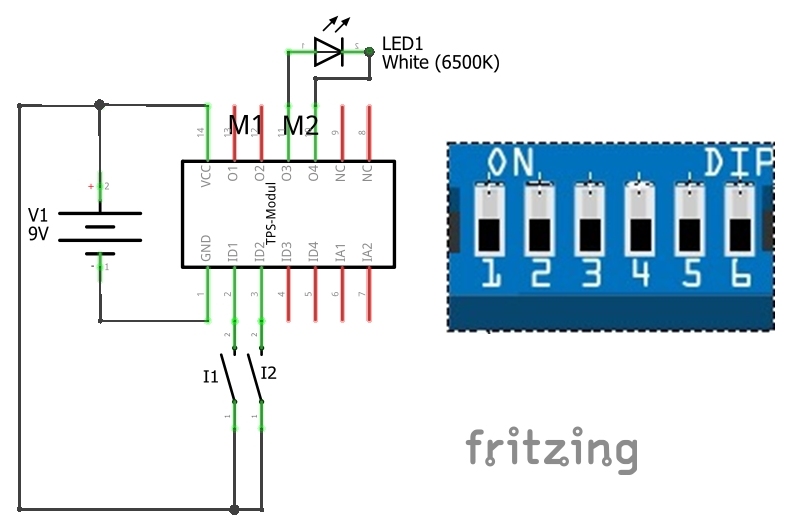 An dem Eingang ID1 werden der Taster I1 als Öffner, am Eingang ID2 der Taster I2 als Schließer angeschlossen, ID3 und ID4 sowie IA1 und IA2 bleiben unbeschaltet. Alle Schiebeschalter DIP1 bis DIP6 sind (nach dem Programmstart) in Stellung „OFF“. Am Ausgang M2 wird eine LED (LED1) für das Alarmlicht angeschlossen.