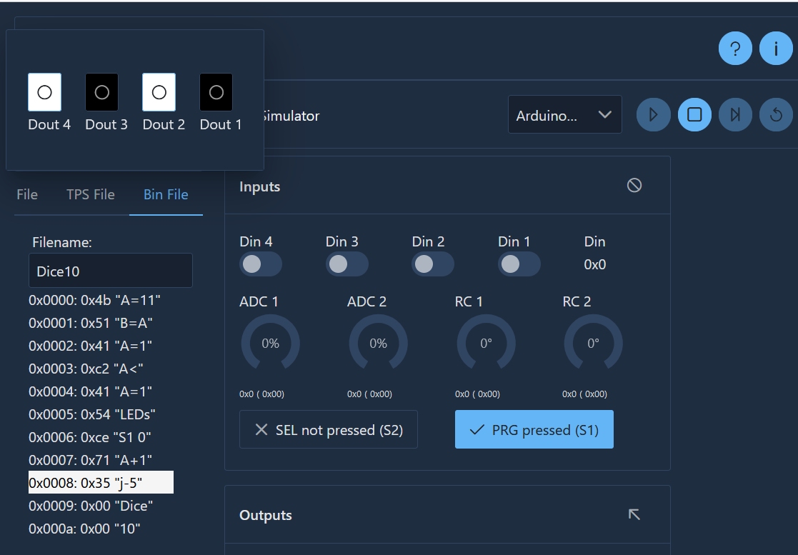 Und tatsächlich, das Programm funktioniert. Solange S1 gedrückt wird, laufen die Binärzahlen von 1 bis A durch.