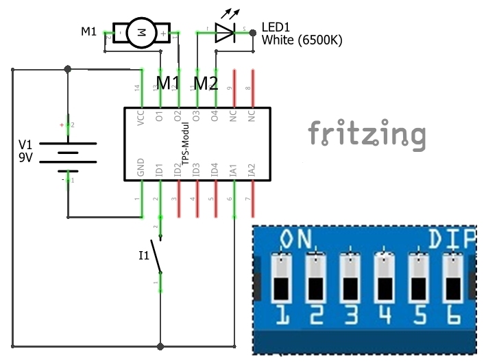 Der nachfolgende Schaltplan zeigt den Anschluss der Sensoren und Aktoren an das TPS-Modul sowie die Stellung der DIP-Schalter nach Programmstart: