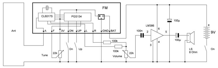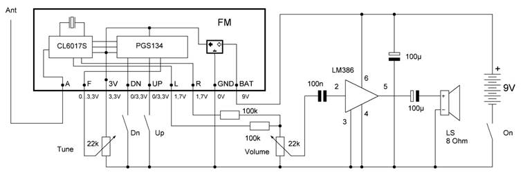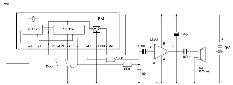 Der Radiobaustein CL6017S besitzt keine Anschlüsse für Bedienelemente, sondern wird durch einen Mikrocontroller über die beiden Leitungen SDIO und SCLK gesteuert. Über diese Verbindung werden neue Empfangsfrequenzen eingestellt, Suchläufe gestartet und gefundene Frequenzen ausgelesen. Der Mikrocontroller ist ein PGS134 mit internem EEROM und AD-Wandler. Mit dem AD-Wandler wird die Stellung des Tune-Potis gemessen, und Stationen werden im EEPROM gespeichert. Die Bedienung des Radios wird durch ein internes Programm im Mikrocontroller bestimmt.