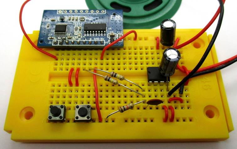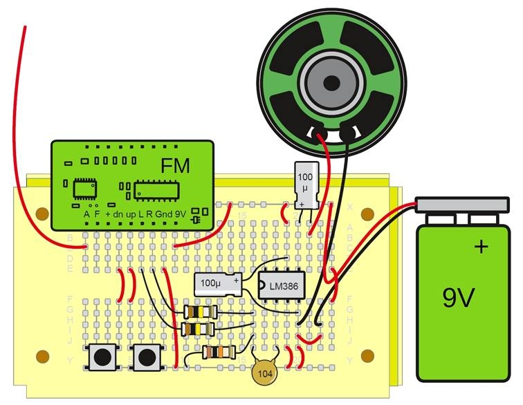 Die Radioplatine liefert eigentlich ein Stereo-Signal an den Ausgängen L und R. Weil aber nur ein Lautsprecher vorhanden ist, werden der linke und der rechte Kanal über zwei Widerstände mit jeweils 100 kΩ zusammenaddiert.