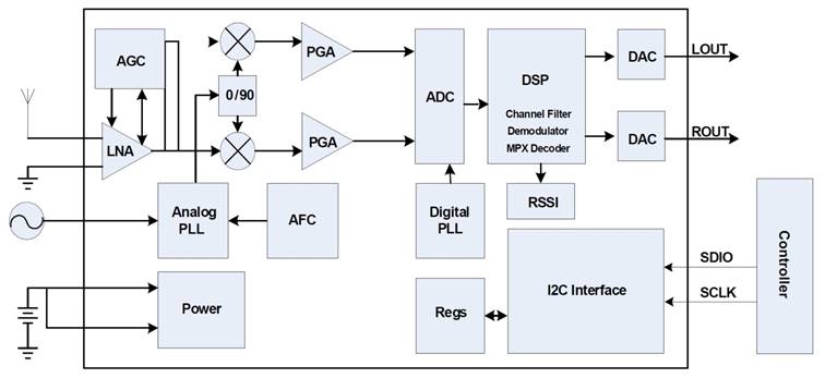 Übliche analoge UKW-Radios verwenden eine Zwischenfrequenz von 10,7 MHz. Die Empfangsfrequenz wird dabei zunächst auf die Zwischenfrequenz umgesetzt und danach analog gefiltert, verstärkt und demoduliert. Dieses Radio arbeitet digital. Der Radiobaustein CL6017S enthält einen digitalen Signalprozessor (DSP). Die Antennensignale werden zuerst auf eine tiefere Frequenz umgesetzt und dann mit einem Analog-Digital-Wandler digitalisiert. Der DSP übernimmt dann die digitale Filterung, die Demodulation des FM-Signals und die Dekodierung des Stereo-Signals. Das Blockschaltbild zeigt den inneren Aufbau des CL6017S.