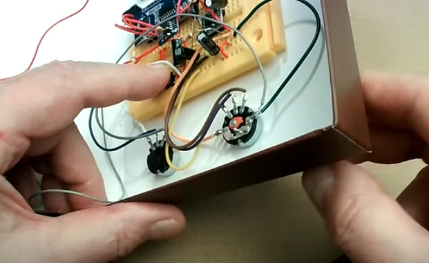 Die Antenne besteht nun aus einer möglichst großen Drahtschleife, die zwischen A und GND angeschlossen wird. Verwenden Sie dafür einen ganzen Meter Draht. Führen Sie den Antennendraht durch die beiden dafür vorgesehenen Löcher, sodass die Antennenschleife außerhalb des Gehäuses liegt. Der Draht sollte an beiden Seiten verdrillt werden, sodass die Antenne stabil gehalten wird und nicht aus den Steckboard rutschen kann.