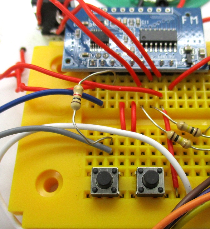 Die Radio-Platine besitzt zwei Anschlüsse für Tastschalter, Up (aufwärts suchen) und Dn (Down, abwärts suchen). Ein kurzer Druck auf den Up-Taster bewirkt, dass jeweils der Sender auf der nächst höheren Frequenz gesucht wird. Wenn Sie bereits den letzten Sender gehört hatten, beginnt die Suche wieder bei der tiefsten Frequenz. Ein kurzer Druck auf den Dn-Taster startet entsprechend eine Suche in Gegenrichtung. Abwechselndes Betätigen von Up und Dn wechselt immer wieder zwischen zwei Stationen.