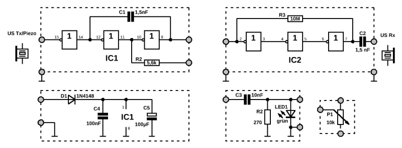 CMOS-Inverter CD4049. Dazu kommen nur wenige Widerstände und