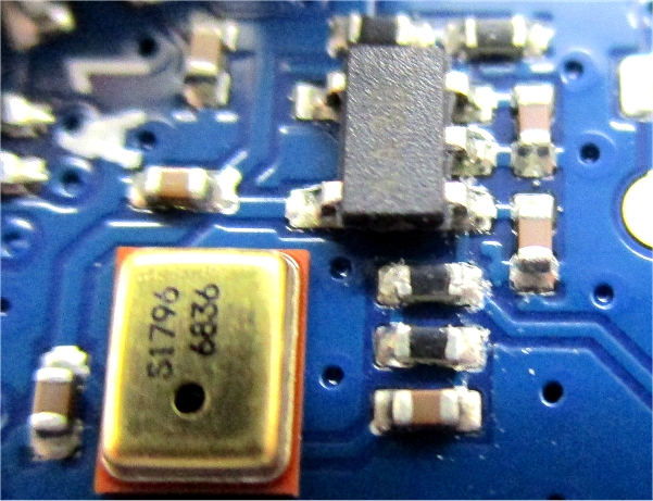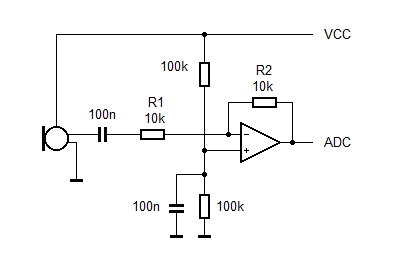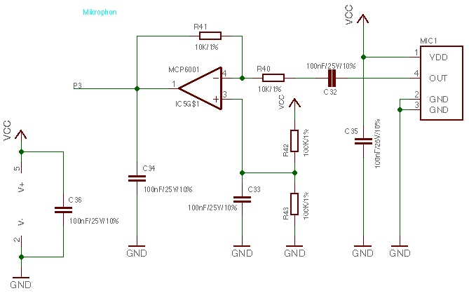 Inzwischen habe ich ja den Schaltplan des Calliope gefunden, und er bestätigt weitgehend die Messungen am Mikrofonverstärker. Da zeichnet sich übrigens ein Weg ab, wie man die Verstärkung minimalinvasiv erhöhen kann. Es sollte reichen, R40 (= R1 in meiner Skizze) mit einem Drähtchen zu überbrücken. Das Mikrofon hat einen Innenwiderstand von rund 100 Ohm. So kommt man auch auf eine 100-fache Verstärkung, allerdings auf Kosten der unteren Grenzfrequenz. Besser wäre es also, R41 durch 1 MOhm zu ersetzen.