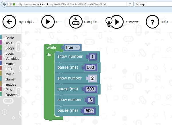 Mit run kann das Ergebnis simuliert werden. Es funktioniert, die Zahlen 1 bis 3 werden im LED-Display gezeigt.