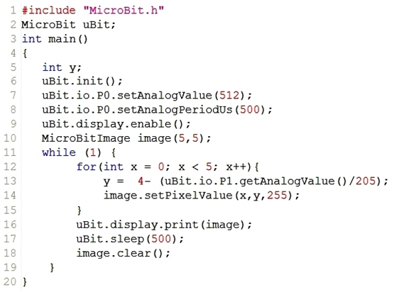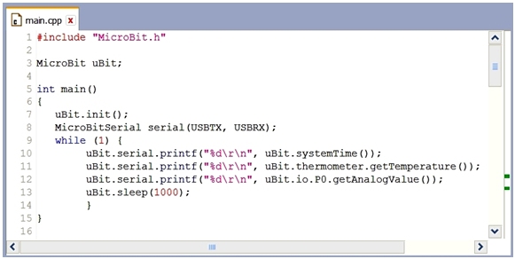 Sobald man in Mbed in eigenen C++-Programmen die Datei MicroBit.h einbindet, ist man wieder ganz auf der Linie der Entwickler. Nun spielt es keine Rolle mehr, welcher Port des Controllers wo angeschlossen ist, man kann sich einfach an die gewohnten Bezeichnungen halten. Außerdem hat man nun wieder die vorgefertigten Funktionen, die auch schon in den Blocks vorhanden waren.