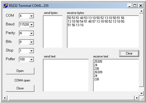Das Beispiel kann man als Text aus dem Programm-Archiv laden. Es wurde als Text-Datei Mbed21.cpp.txt abgelegt. Man kann es mit einem Editor öffnen und dann in ein vorhandenes main.cpp kopieren. Zum Testen des Programms wird ein beliebiges Terminal eingesetzt. Hier muss eine Übertragungsrate von 115200 Baud eingestellt werden.