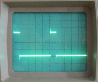 Oszilloskop zeigt ein Rechtecksignal mit kurzen Impulsen. Das bedeutet