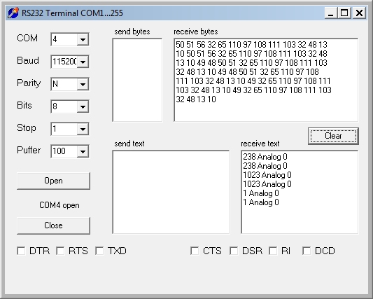 Die Schnittstelle läuft diesmal mit 115200 Baud. Die Spannung am Pin 0 wird wie geplant angezeigt.