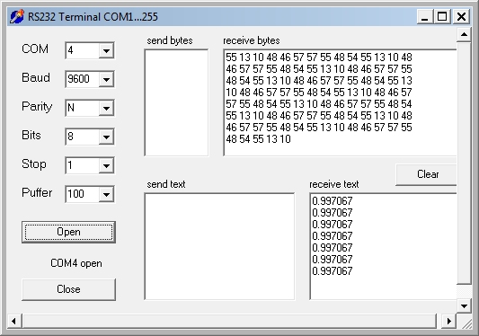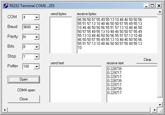 mit 9600 Baud. Im Terminal kann die Spannung am Pin 1 angezeigt werden.
