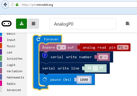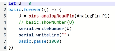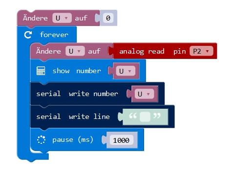 umgesetzt. In der Script-Form sieht man, dass basic.showNumber(U)