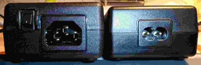 Links: Laptop-PSU, Gerätebuchse mit Erdanschlusskontakt. Der