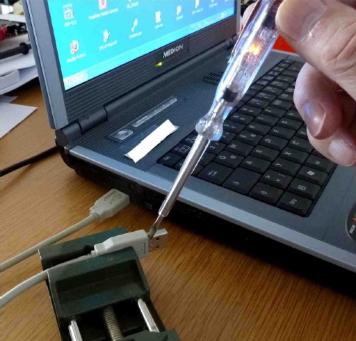 Phasenspannungsprüfer, meine linke Hand berührt dabei den
