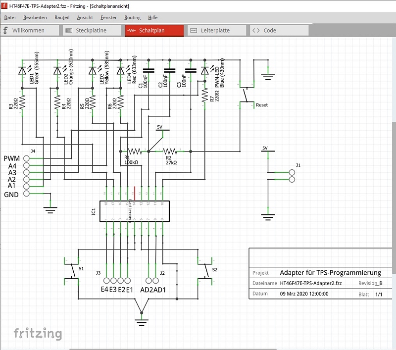 Die Entwicklung hat ca. 12 Stunden gedauert (da ist aber die Einarbeitung in das für mich neue Programm enthalten). Ich habe alles mehrfach geprüft und immer wieder noch Details verbessert. Manchmal ergeben sich kleine Fehler beim Auto-Routing und beim Ändern und vor allem Springen zwischen den Bereichen, die man manuell korrigieren muss. Außerdem stimmen manchmal die Beschaltung oder Abmaße einzelner zu verwendender Bauteile nicht mit denen aus dem gegebenen Zeichensatz überein. Dann muss man einzelne Teile ändern oder selbst konstruieren. Das ist teilweise zeitaufwendig!