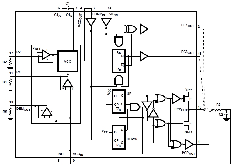 Phasenkomparator. Meine Versuche verwenden den CD4046. Der HC4046 kommt