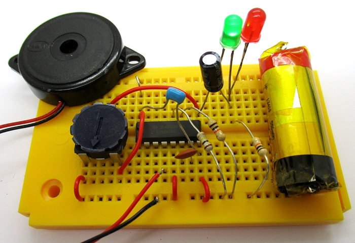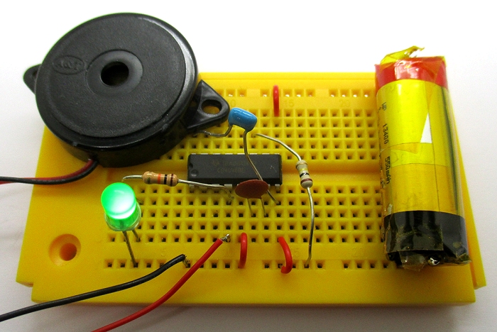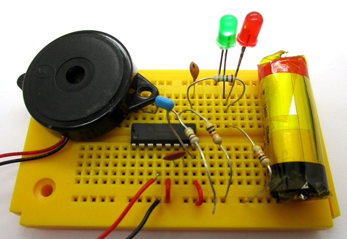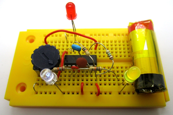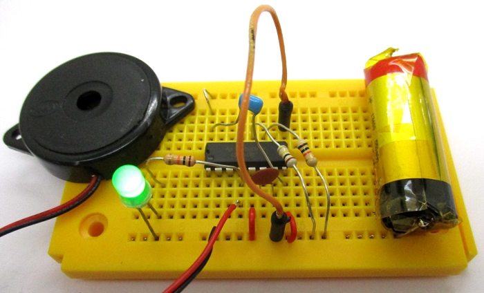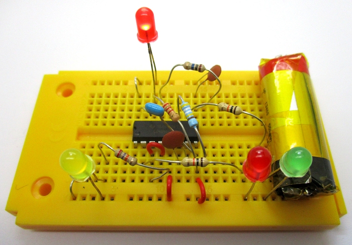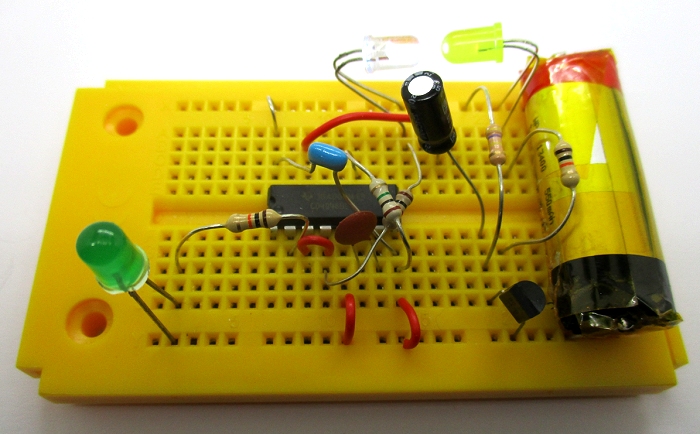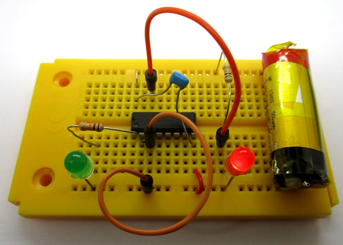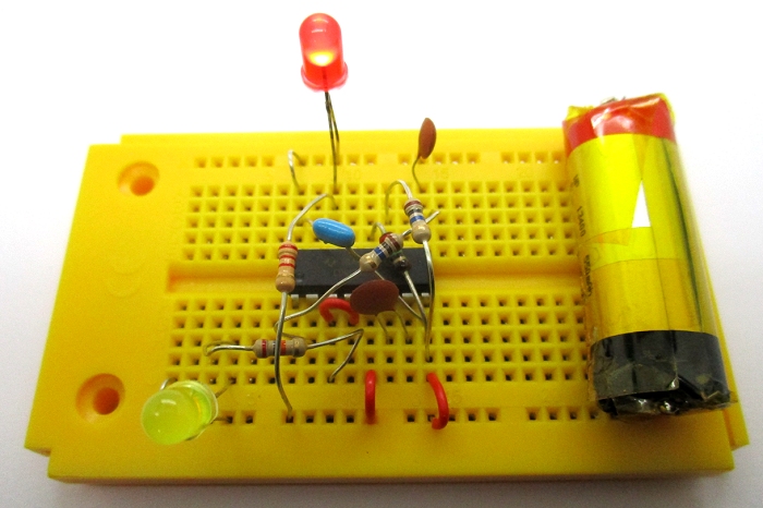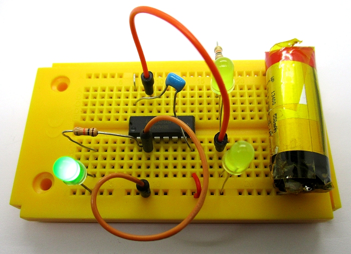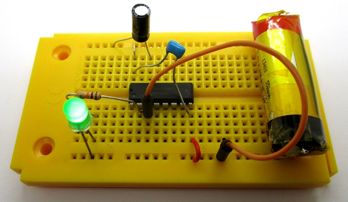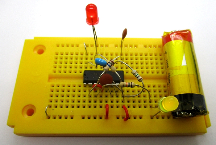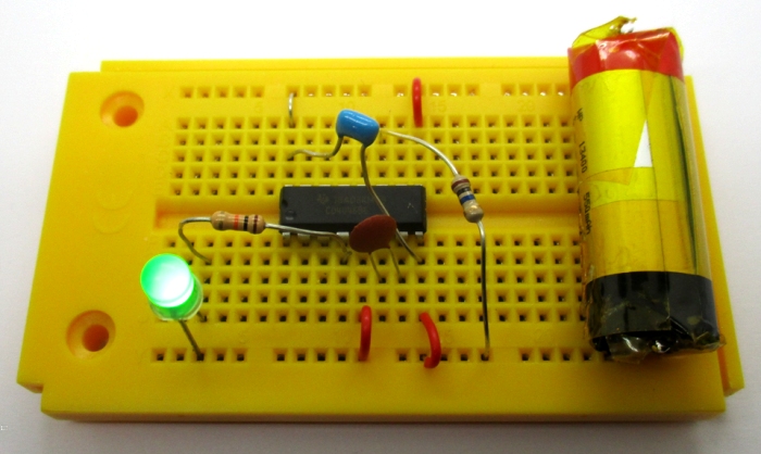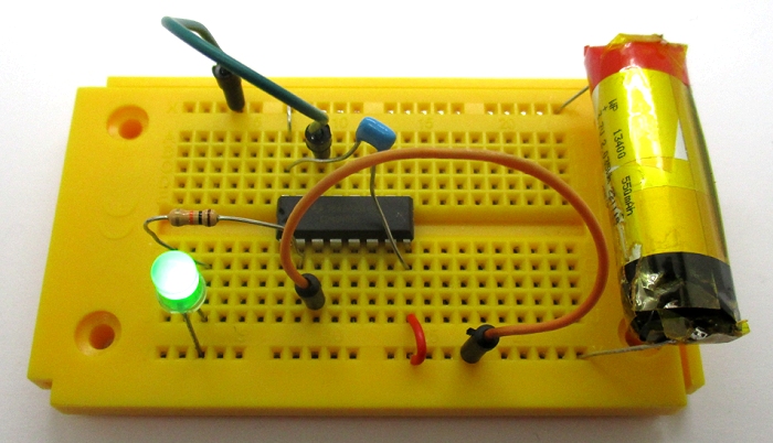 Diesmal steuert eine rote Blink-LED den Eingang am Pin 4. Das