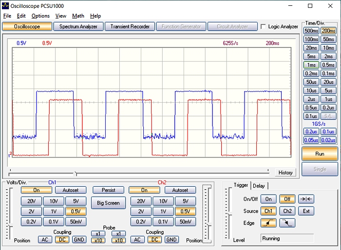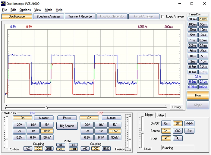 Übereinstimmung der ersten Flanke beider Rechtecksignale. Die rote LED