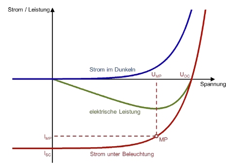 Die Kennlinie bei Beleuchtung ist dann um den Kurzschlussstrom (skaliert mit der prozentualen Einstrahlung) versetzt: