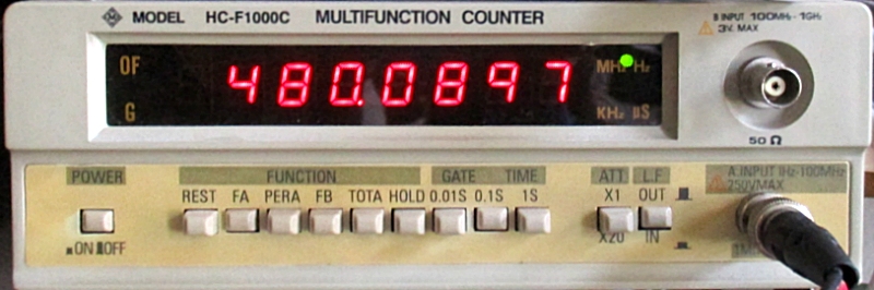 Frequenzzähler zeigt ca. 480,1 Hz. Das Signal steht stabil wie bei
