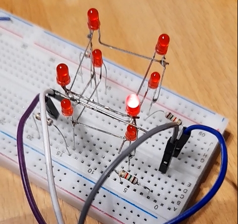 Mit nur acht LEDs kann man einen kleinen Würfel mit LEDs an den acht Ecken bauen.