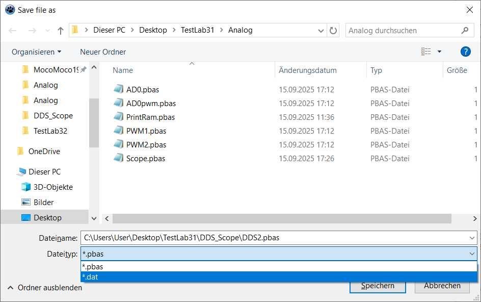 gespeichert werden. Dazu schaltet man vom Dateityp *.pbas auf *.dat um.