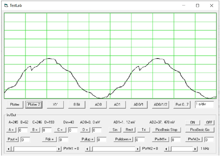 Das Programm Record.pbas nimmt 256 AD-Samples in 20 ms auf und gibt sie dann rund 100-fach langsamer über den PWM-Ausgang