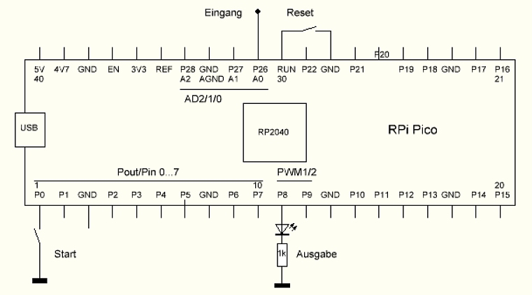 Wer sich das Programm genau ansieht, erkennt den Pullup an P0 und die