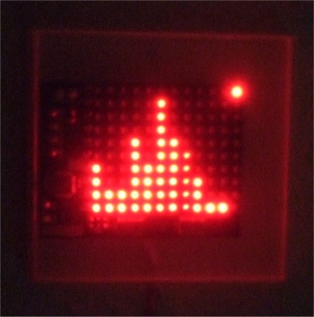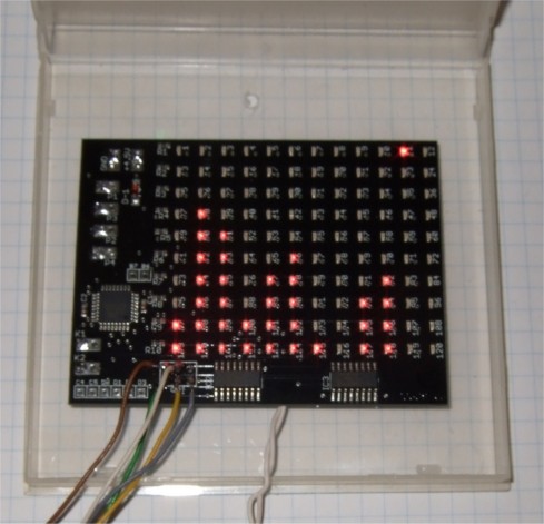 Blitzsignale im VLF Bereich kann man recht gut empfangen und zählen. Mit der Pong Platine und der 12 * 10 Led Matrix lassen sich die Zählergebnisse zusätzlich auch graphisch darstellen, als Balkenddiagramm. So erhält man die Übersicht, wie oft es pro Zeiteinheit geblitzt hat. Falls innerhalb der Zählzeit von 10 Sekunden Impulse an Int0 eintreffen, dann inkrementieren sie den Blitzzähler. Danach geht es weiter von links nach rechts zur nächsten Spalte. Die Led ganz oben in Zeile 1 zeigt an, wo gerade gezählt wird. Wenn nichts passiert dann wandert die Led Anzeige alle 10 Sekunden eins nach rechts. Der erste Blitz setzt die Zeit zurück und die Zählung beginnt ganz links in der ersten Spalte, dafür sorgen zwei Flags im Programm. Nach einem vollen Durchlauf von 120 Sekunden werden die Flags wieder zurückgesetzt. Jetzt könnte man die Led Matrix löschen, das wird hier aber nicht gemacht. Man sieht jeweils die Aktivität der letzten 2 MinutenDie Balkendiagramm Anzeige, die Blitze werden 10 Sekunden lang gezählt