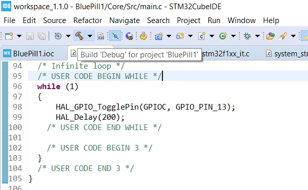 eingegeben habe, klicke ich auf den Hammer: Build ´Debug´ for project