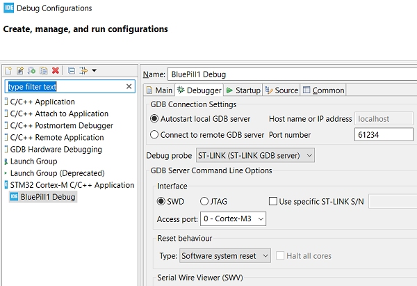 Dann wird der Debugger gestartet. Unter Run/Debug Configutations.../Debugger muss noch der ST-Link ausgewählt werden.
