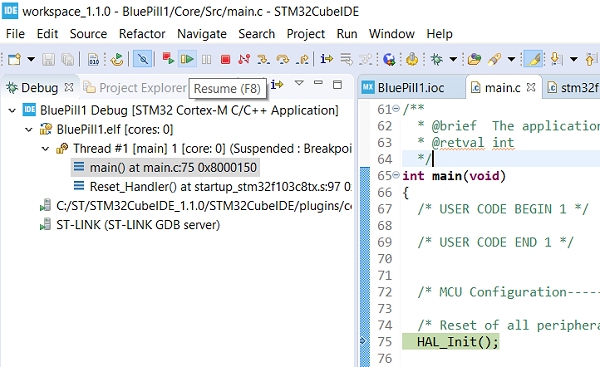 HAL_Init(); einen Breakpoint gesetzt hat. Mit Resume, F8 oder dem