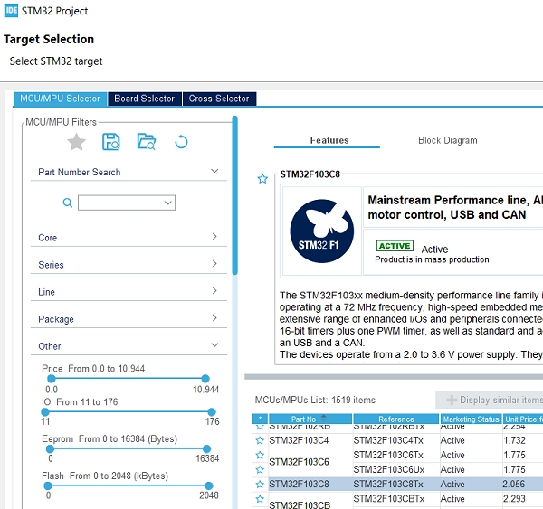 Nun startet man ein neues STM32-Projekt. Dazu muss man zuerst den Zielprozessor auswählen, in diesem Fall den STM32F103C8.