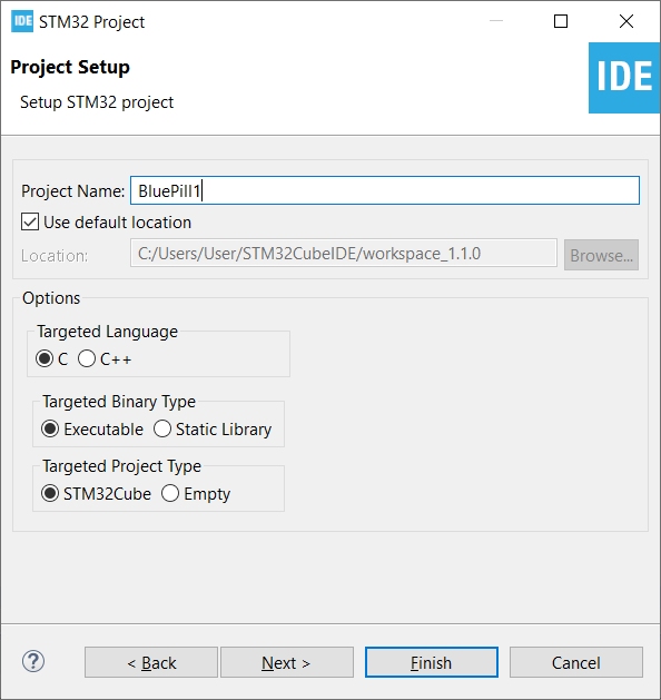 Dann muss das Projekt einen Namen bekommen, in diesem Fall BluePill1.