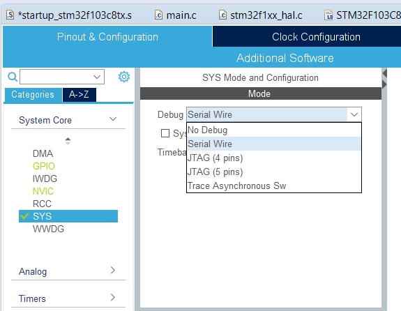 Core/SYS/Debug. Da muss unbedingt Serial Wire ausgewählt werden, denn