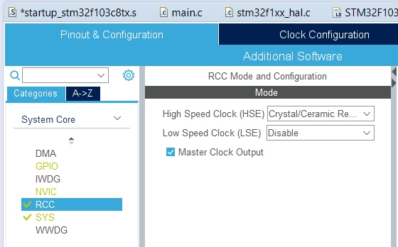Unter System Core/RCC kann man einstellen, dass man den Quarz