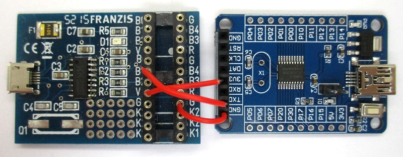in das Testboard Pfostenbuchen. Zum Programmieren kann nun das