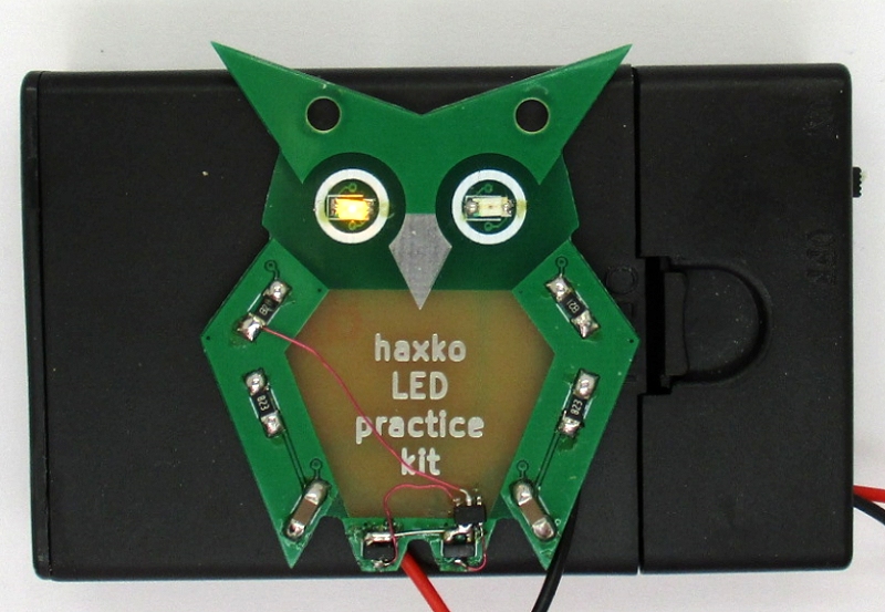 klassischen Multivibrator mit zwei NPN-Transistoren. Das haxko SMD LED practice kit ist ausführlich auch auf Github dokumentiert. Diese kleine Eule hat viele Monate lang vor sich hin geblinkt.